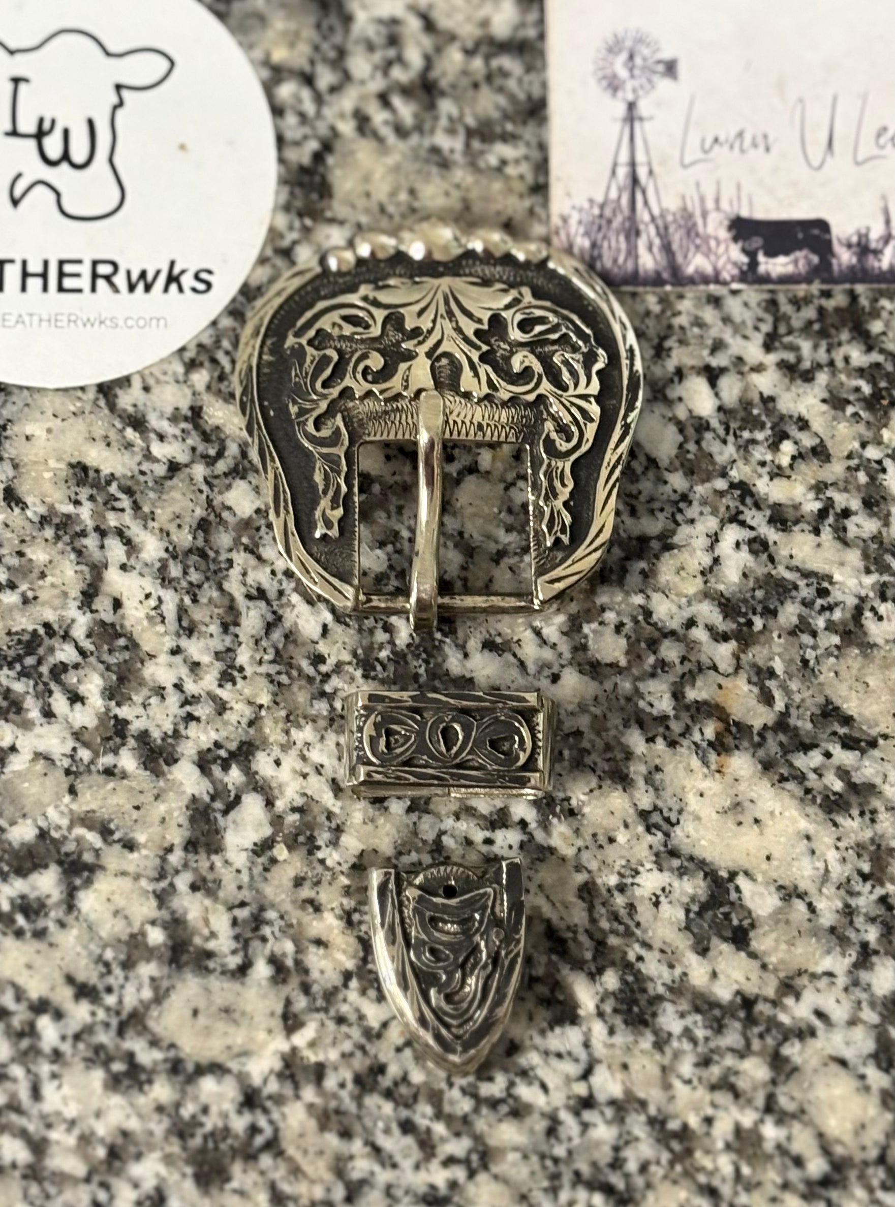 This little fancy buckle is made by Hansen Silver and features a sterling silver overlay. This set includes the keeper and tip. Fits a 5/8” strap.